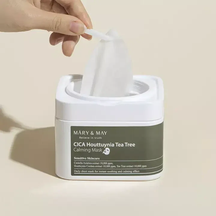 Het Mary & May Cica Eoseongcho Tea Tree Calming Mask Pack, met Centella asiatica-extract + Houttuynia cordata-extract + theeboomextract, heeft uitstekende ontstekingsremmende en verzachtende effecten voor snel herstel en onmiddellijk effect, een dagelijks verzachtend verzorgingsmaskerpakket, in een verpakking van 30 stuks!